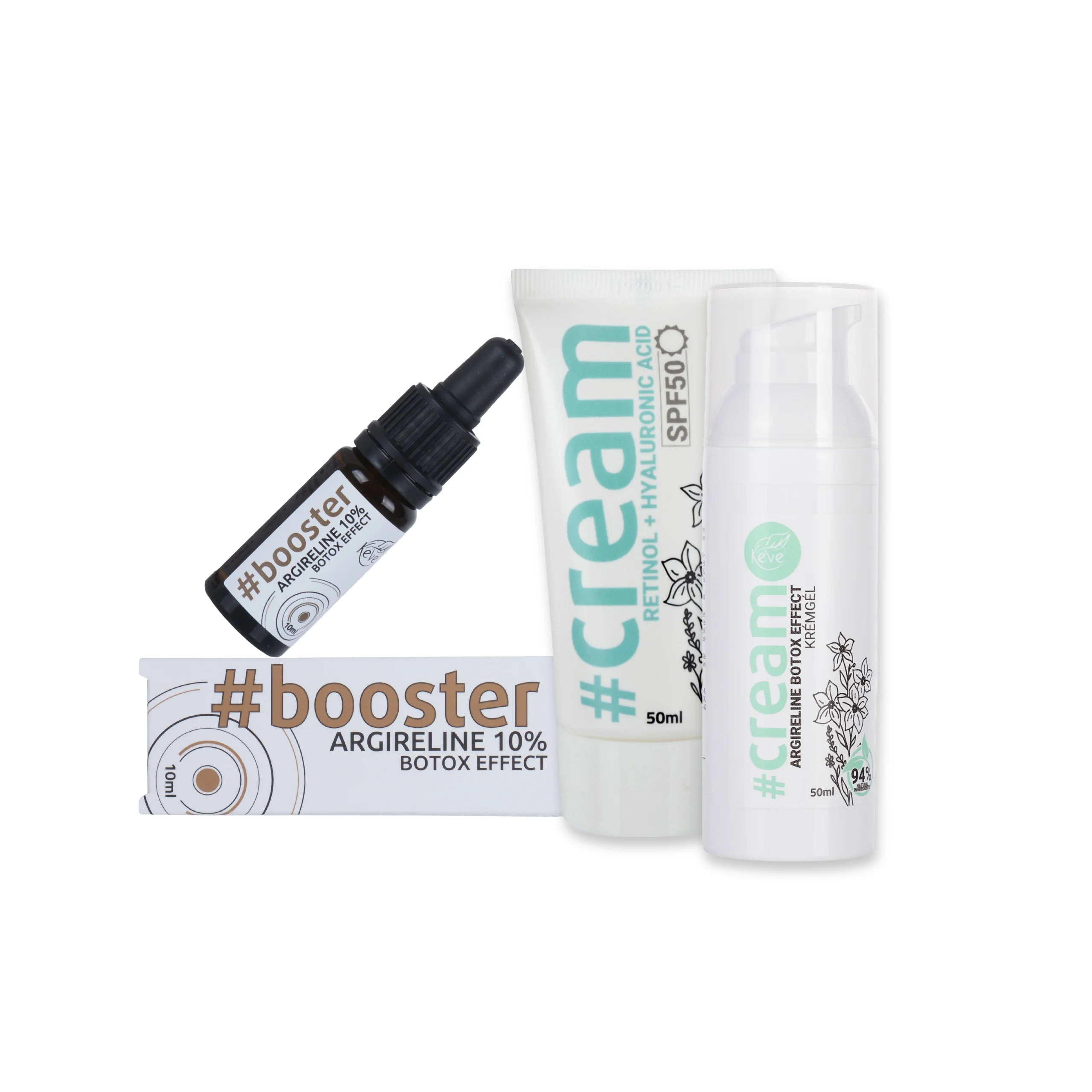 RUTINA DE DIMINEAȚA Pasul 1 – curățarea feței (spălare, apă călduță) Pasul 2 – îndepărtarea ridurilor, fermitate – #esență 10% Argireline esență efect b.o.t.o.x 10 ml Pasul 3 – hidratare, protecție solară – #cremă SPF50 Retinol 0,5% + protecție solară cu acid hialuronic pentru față crema 50 ml